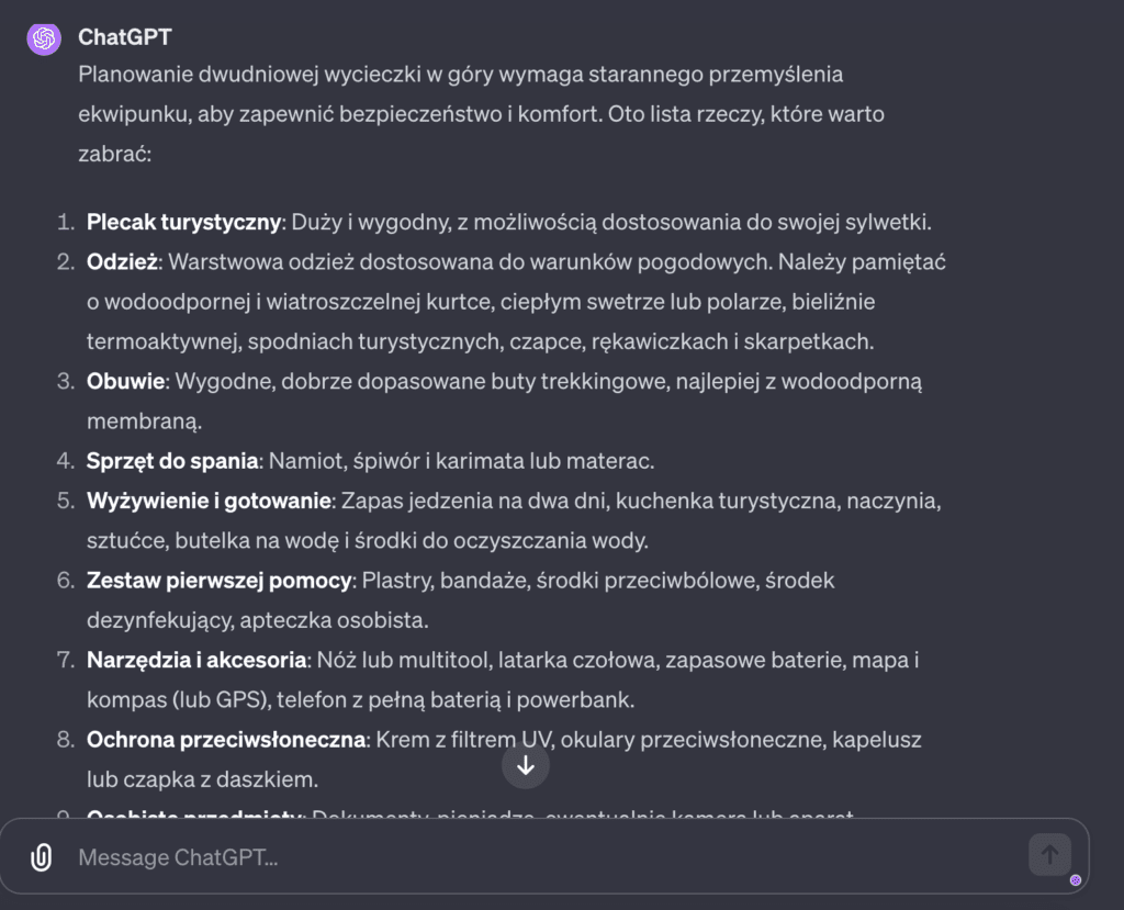 Załóżmy, że chcemy przygotować się na 2-dniowy wyjazd w góry. Możemy poprosić wirtualnego asystenta o podanie najważniejszych rzeczy, które musimy wziąć na taką wyprawę. Możemy:
