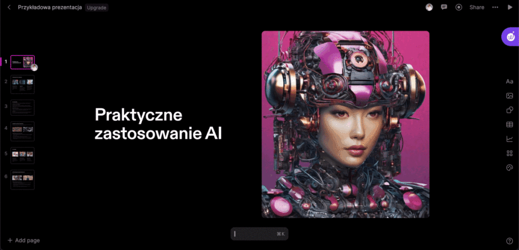 Chcemy stworzyć prezentację dotyczącą ,,Praktycznego zastosowania AI”. Możemy: